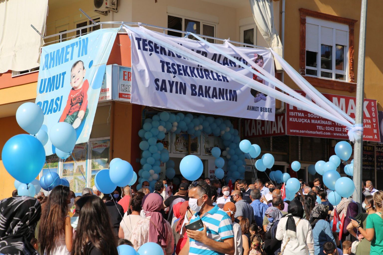 Ahmet bebeği uğurlama törenine Alanya Ticaret ve Sanayi Odası (ALTSO) Başkanı Mehmet Şahin, Alanya Emniyet Müdürü Alper Avcı, Alanya Müftüsü İhsan İlhan, CHP İlçe Başkanı Coşkun Karadağ, İyi Parti İlçe Başkanı Alper Arıkan ve Ahmet bebeğin yakınları katıldı. Müftü İlhan’ın ve katılımcıların duasının ardından Ahmet bebek, ailesiyle Amerika’ya doğru hareket etti. ALTSO Başkanı Mehmet Şahin, “Alanya’mızın kadirşinas halkının SMA hastası Ahmet bebeğini coşkulu bir törenle uğurladık. Minik yavrumuza 4,5 ay sürecek tedavisinin ardından Rabbimden sağlık içinde uzun ve başarılı bir ömür dilerim” dedi. Tören sırasında Alanyalı Dışişleri Bakanı Mevlüt Çavuşoğlu’na da teşekkür pankartı açılırken, söz verip de paraları Ahmet bebek için açılan banka hesabına yatırmayanların ise önümüzdeki günlerde afişe edileceği öğrenildi.