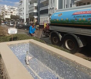 Alanya Belediyesi temizlik işlerine bağlı ekipler Mahmutlar’da cadde ve sokakları boydan boya yıkayarak sezona hazırlıyor.