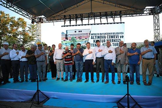 Antalya Büyükşehir Belediyesi’nin Altınova Kültür Merkezi ve Cemevi Projesi’nin temeli törenle atıldı. Başkan Menderes Türel, “Alevi kardeşlerime verdiğim bir sözü yerine getiriyor olmanın huzuru ve mutluluğunu yaşıyorum” dedi. Başkan Türel “Bizi bize düşman etmeye çalışanlar bugüne kadar Alevi kardeşlerimizin hoşgörüsü altında hep ezildiler. İnanıyoruz ki bundan sonra da ezilmeye devam edecekler” diye konuştu. Alevi Dedesi Zeynel Demir’de Alevi dostlarına “Başkan Türel’in yakasını sakın bırakmayın” diye seslendi.