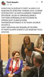 Sosyal medyada aday olacağının sinyalini veren İyi Parti Alanya Kurucu İlçe Başkanı Yücel Apaydın, aday olup olamayacağı konusunda açıklamada bulundu