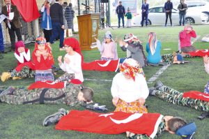 MAHMUTLAR Oktay Cebeci Caminin bahçesinde yapılması planlanan ve hava muhalefeti nedeniyle Halı sahada gerçekleşen Çanakkale Zaferinin yıldönümünde Halil Ülker İlk Öğretim okulu öğrencilerinin sunduğu savaş temalı gösterisi gözleri doldurdu.