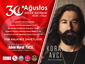 Perşembe günü kutlanacak 30 Ağustos Zafer Bayramı’nın 96. Yıldönümünde, Alanya Belediye Başkanı Adem Murat Yücel, sevilen sanatçı Koray Avcı’yı Alanya halkı ile buluşturacak.